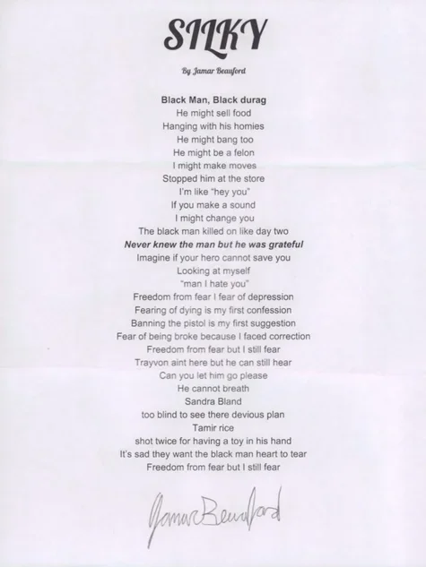 The Winner of the 2018 CREATE 4 FREEDOM℠ Poetry Contest is 17 year old Jamar Beauford from Hudson, New York for his entry “SILKY”.
