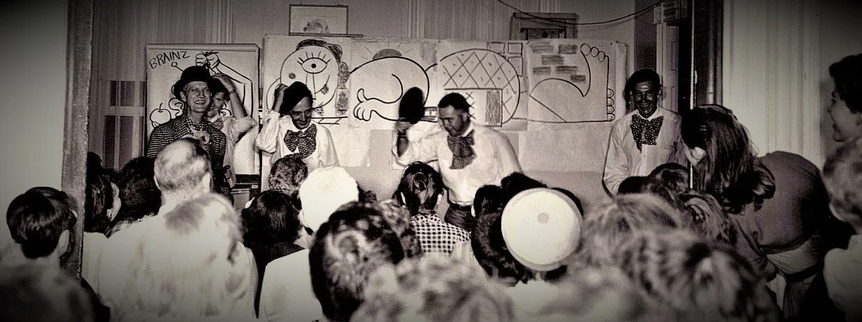 Photo taken at the Arlington Community House at the 1955 Street Fair. (On stage from left to right): Frank Hall (M.C. of the event) George Hughes (barely visible), Norman Rockwell, Vic Donahue, and Don Trachte. Photo is from the Collection of Don Trachte, Jr.